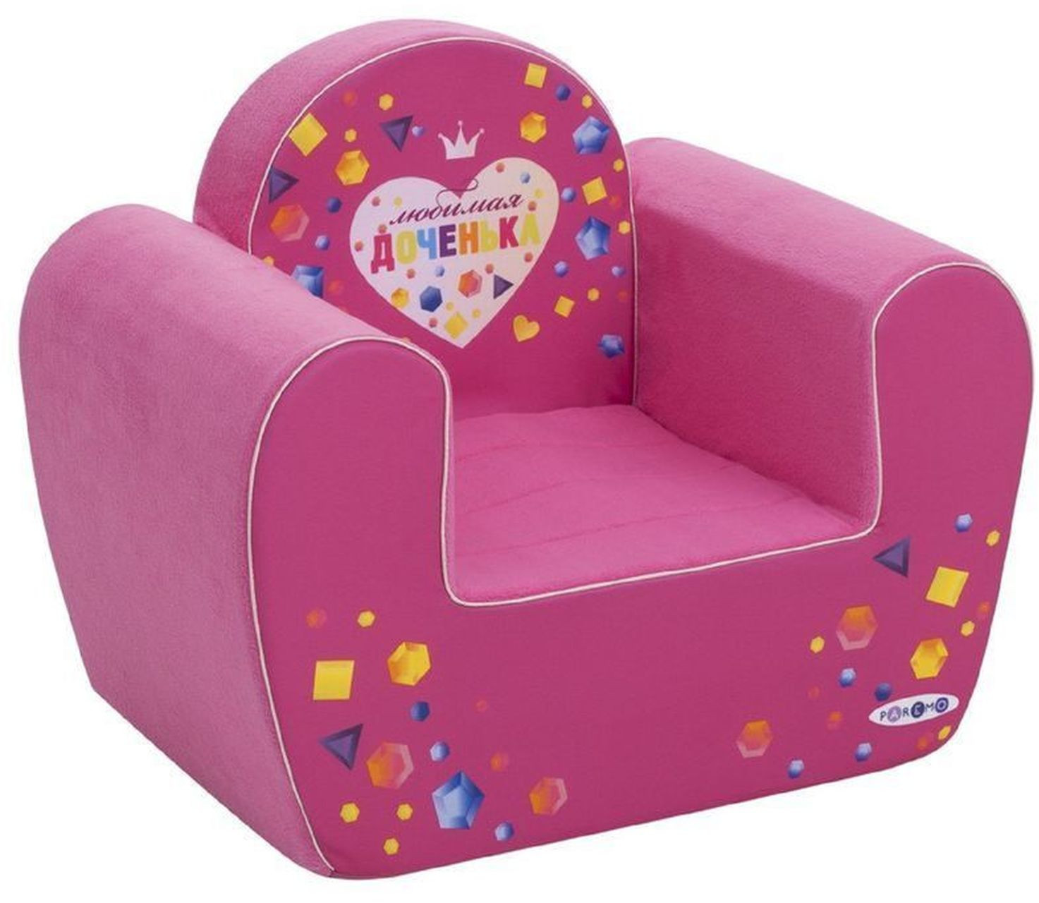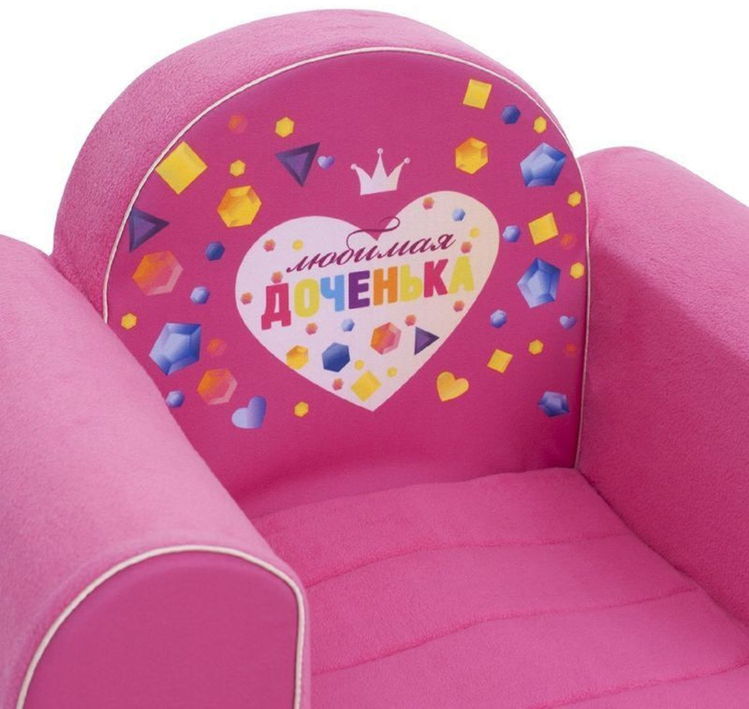 • кресло выполнено в розовом цвете. Украшено принтами из драгоценных камней и самоцветов. На спинке креслица большое сердце с мини-короной и надписью «Любимая Доченька» — один из самых популярных хэштегов к фото маленьких маминых и папиных дочек в соцсетях;
