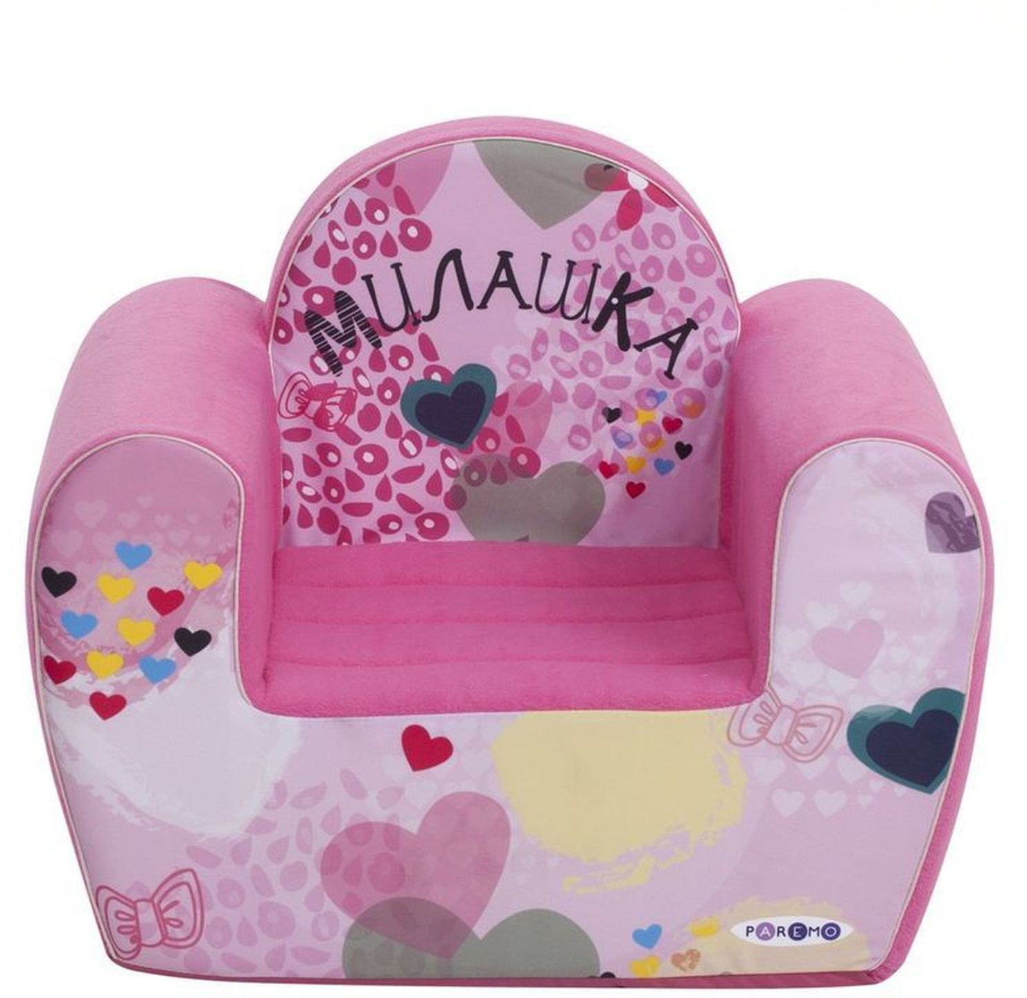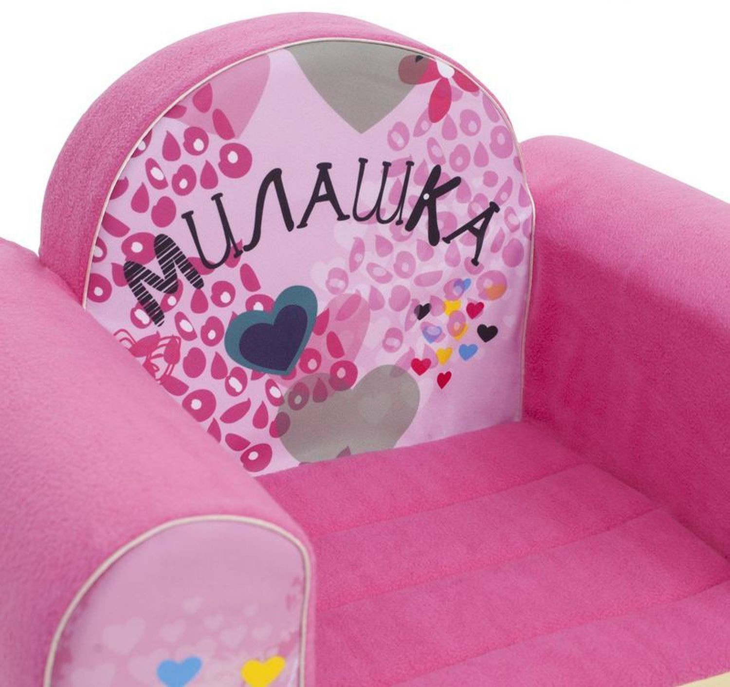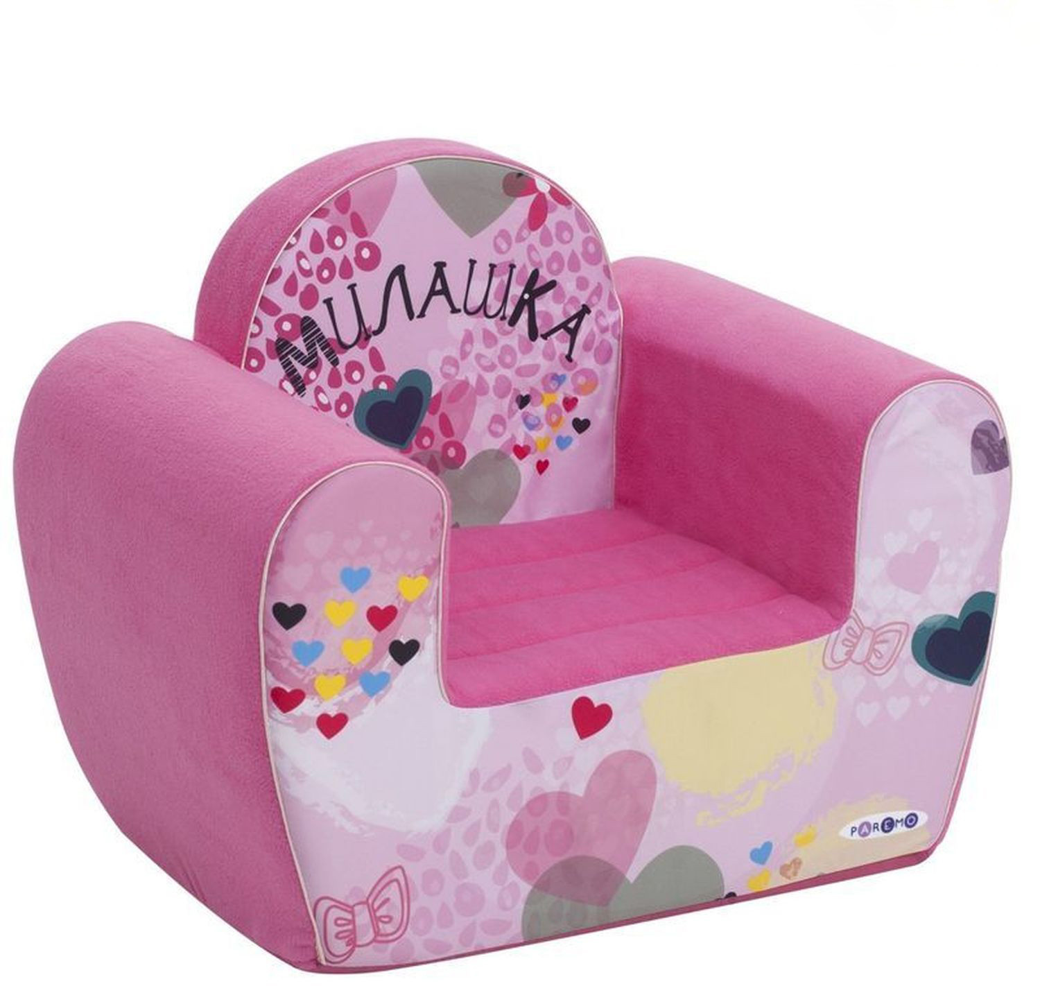 • кресло выполнено в милом розовом цвете. Украшено активными принтами из сердечек, бантов и абстрактных фигур. На спинке креслица объемная надпись «Милашка» — один из самых популярных хэштегов к фото маленьких маминых и папиных дочек в соцсетях;