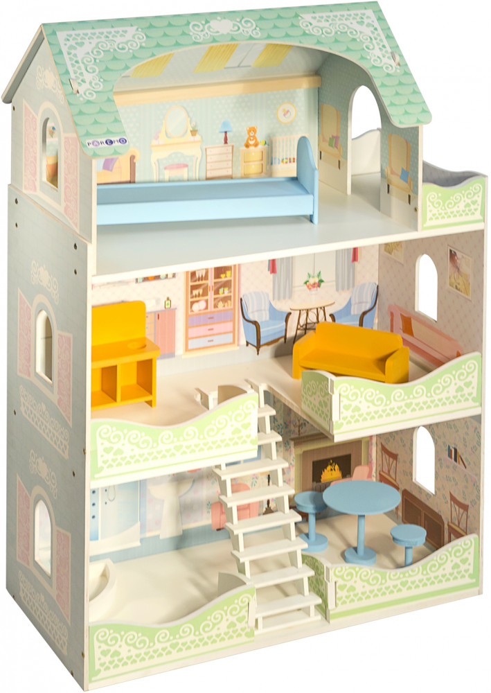 • каркас домика для кукол «Вивьен Бэль» мятного цвета. Окна (декоративные, не открываются) и балкон, контрастируя с цветом фасадов, придают дому классический и выдержанный стиль. Крыша декорируется орнаментом в виде черепичной кладки;
