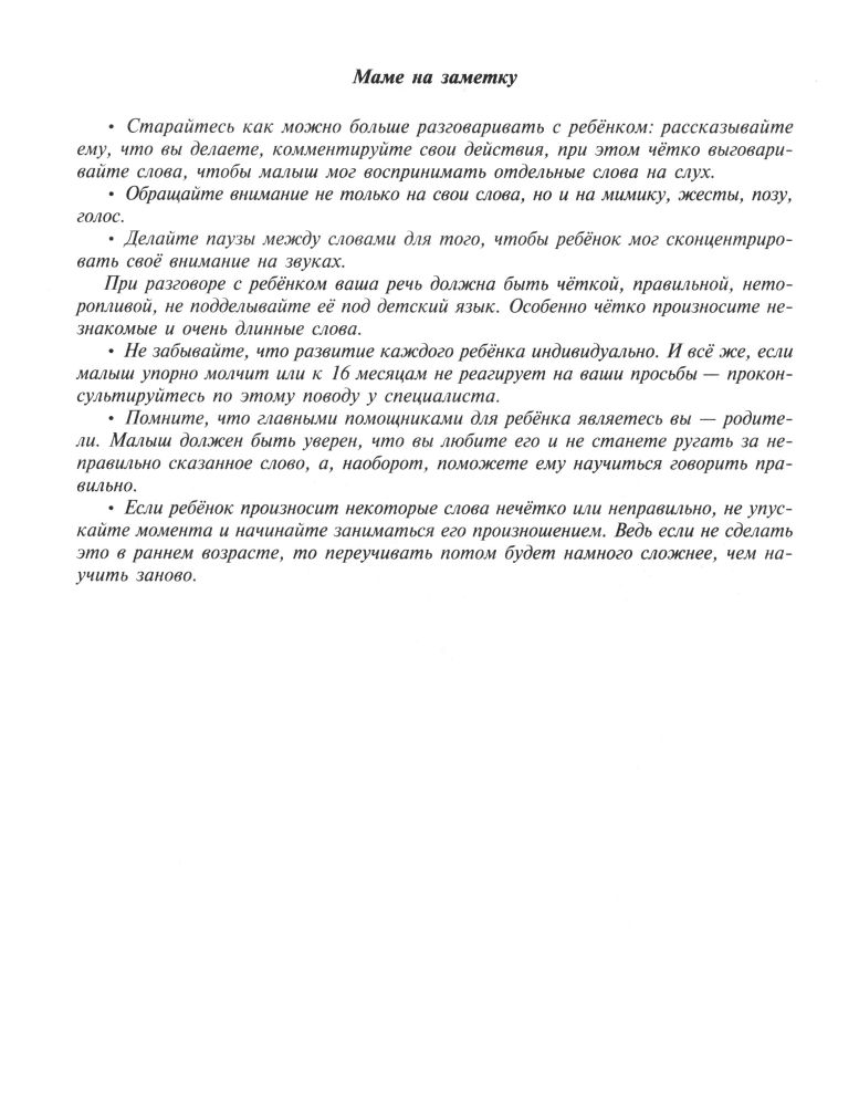 Прекрасно подойдёт для родителей, чтобы научиться, как правильно заниматься с малышом. Содержание: Особенности речевого развития детей от 0 до 3 лет. Игры и упражнения для развития речи у детей от 0 до 1 года Игры и упражнения для развития речи у детей от 1 до 3 лет формирование обобщающих понятий. советую молодым мамочкам.