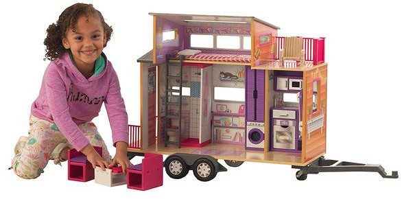 Благодаря тому, что кукольный домик установлен на колеса, дети смогут самостоятельно перемещать его по комнате, представляя, что любимые куклы отправились в увлекательное путешествие. Домик имеет современный дизайн, внутри устроено все с комфортом и уютом. Мебель в комплекте дети смогут расставить по своему усмотрению, кроме раскладного столика, прикрепленного к стене.