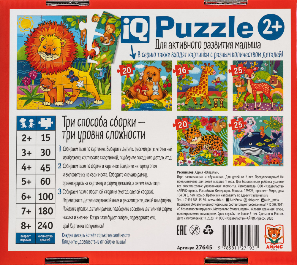 💳 Оплатить за товар можно при получении 🇰🇿 Есть бесплатная доставка по Казахстану от 1 дня 🎁 Копите бонусы с каждой покупки Серия: IQ Пазлы Пазл с изображением льва состоит из 16 элементов. Размер картинки 32×32 см. Материал идеально подходит для детских ручек. Большие детали выполнены из плотного толстого картона. Благодаря этому они ровно лежат, замки легко соединяются и хорошо держатся. По тактильным ощущениям малыш сразу понимает, правильно ли он собрал пазл. |