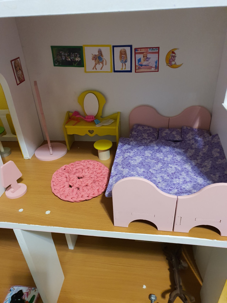 Очень жаль, что кроватка пришла сломанная - я так понимаю, повредили во время транспортировки. И это недочет фабрики - в коробке не было никаких умягчителей и бумаги, чтобы мебель не поломалась внутри. Мебель в коробке уже собрана и покрашена, поэтому сломалась легко. Пришлось клеить кроватку - дочка уже не дала оформить возврат. Торшер и настольная лампа не такие, как на фото, они тоже розовые, но плоские, смотрится все равно неплохо.