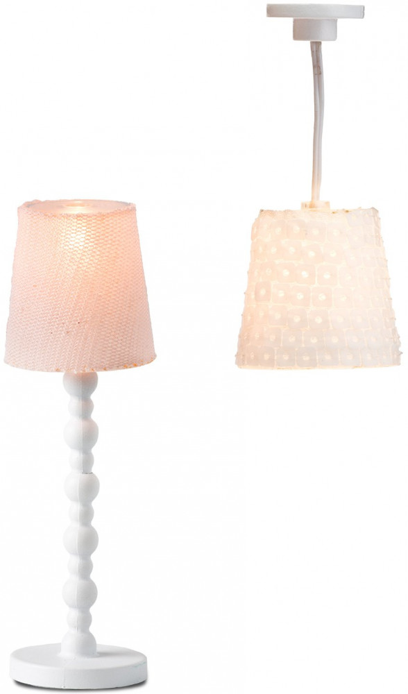 Торшер в романтическом стиле на современной ножке стального цвета и ярко оранжевым абажуром. Люстра с абажуром из белой светящейся ткани. Для подключения освещения необходимо установить светильники на штатные места, предусмотренные в кукольном домике. Также можно переставить светильники в нестандартное место, для этого необходимо воспользоваться набором удлинителей, которые входят в линейку дополнительных аксессуаров «Lundby».