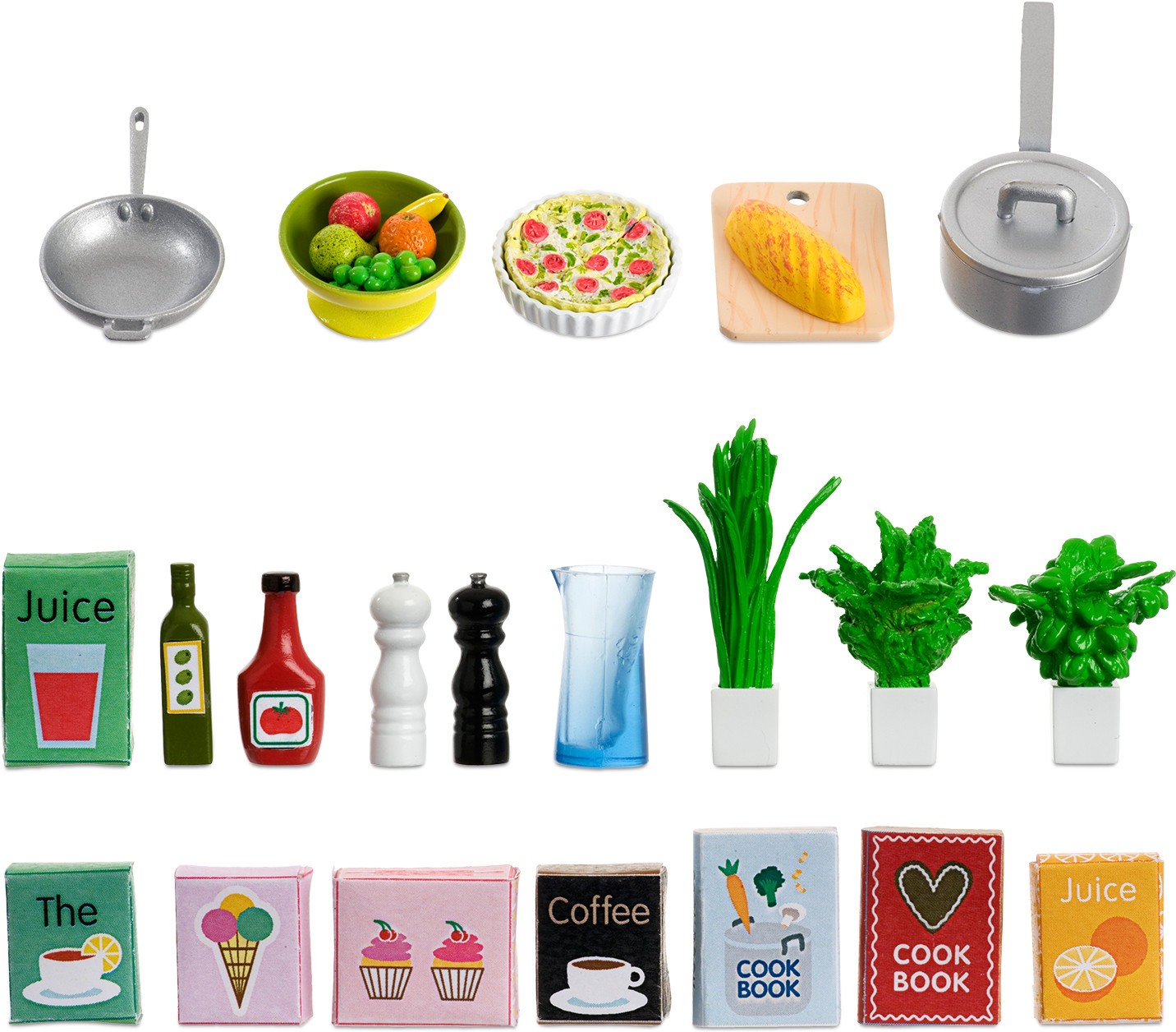 Lundby Набор кухонных аксессуаров для кукольного домаВ данный момент этот товар отсутствует в продаже. Возможно, у нас найдется аналогичный или похожий товар здесь. Пригласите компанию для ужина на кухне или прекрасного обеда в саду! Набор из забавных аксессуаров для готовки. В набор входят: котелок, ваза с фруктами, пирог, хлеб, разделочная доска, сковорода, солонка и перечница, кувшин, зелень, кетчуп, оливковое масло, сок, поваренные книги и другие продукты питания. |