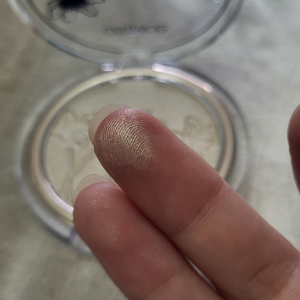 Отличный бюджетный хайлайтер, шелковистая текстура, идеально наслаивается и тушуется, крупных явных блесток нет, но нужная хорошая кисть, сильно пушистой не набирается, можно наносить пальцем. Слегка может подчеркивать рельеф кожи. При носке не лице не скатывается, с тональным не конфликтует. Небольшой минус, что со временем текстура хайлайтера в рефиле забивается. У меня оттенок 020, металлизированный, с кремовым эффектом розовый жемчуг или шампань, фото не передает истинный цвет, гуглите свотчи. Советую однозначно.
