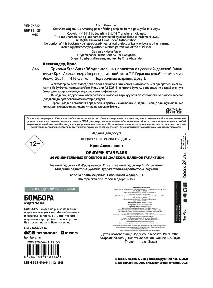 Оригами Звездные войны. 36 удивительных проектов из далекой, далекой ГалактикиВ данный момент этот товар отсутствует в продаже. Возможно, у нас найдется аналогичный или похожий товар здесь. Серия: Подарочные издания. Досуг Бестселлер во всем мире! Дети любят оригами, а что может быть круче, чем превратить лист бумаги в Бобу Фетта, принцессу Лею, Йоду или R2-D2? И не просто бумагу, а специально разработанную бумагу, иллюстрированную персонажами из фильмов. |