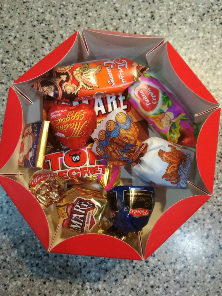 По одной конфетке, разного вида. Коробочка для небольшого презента.