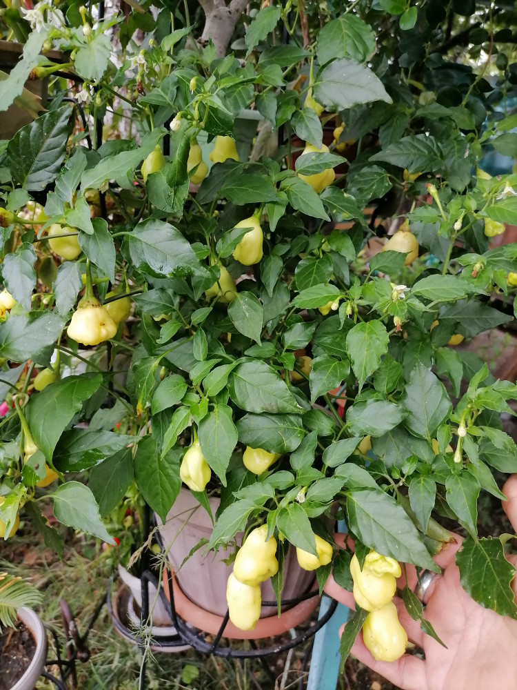 Весь увешан перчинками, кустик раскидисты, в горшке сантиметров 30,в грунте вырос см 50-60 и перчинки крупнее.