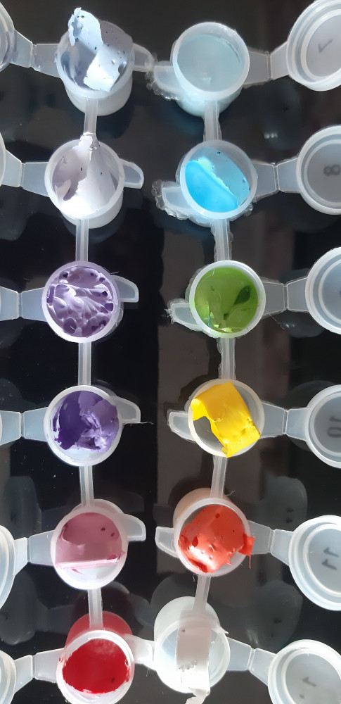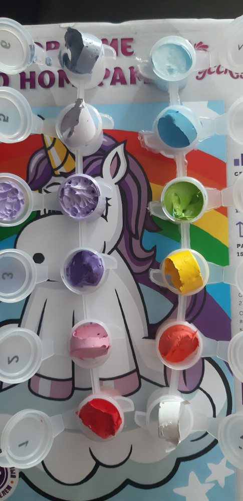 Картинка красивая, на плотном картоне. Краски акриловые. Из 12 цветов только номерами 4,7,9 можно разукрашивать. Остальные 9 цветов сухие, т.е резиновые.