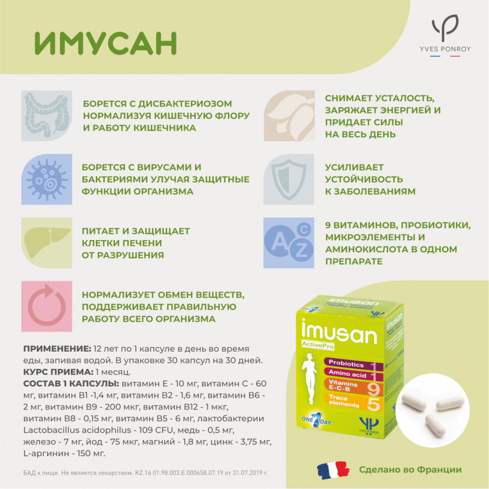 Yves Ponroy Капсулы для иммунитета «Имусан»В данный момент этот товар отсутствует в продаже. Возможно, у нас найдется аналогичный или похожий товар здесь. «Имусан» — самый полный сбалансированный витаминно-минеральный комплекс для всей семьи. Крепкий иммунитет, здоровый кишечник, энергия и тонус на весь день! 9 витаминов, прибиотики и микроэлементы и аминокислота в одном препарате. |