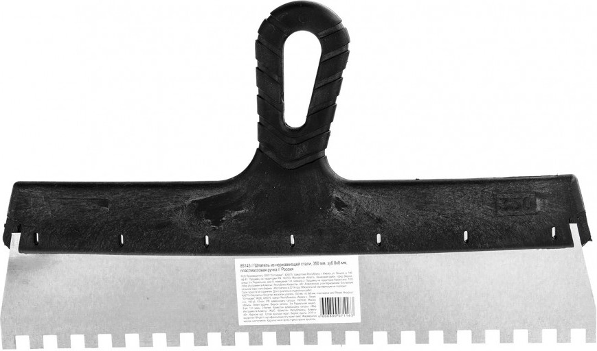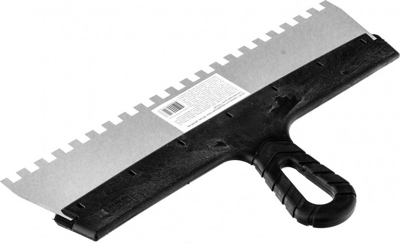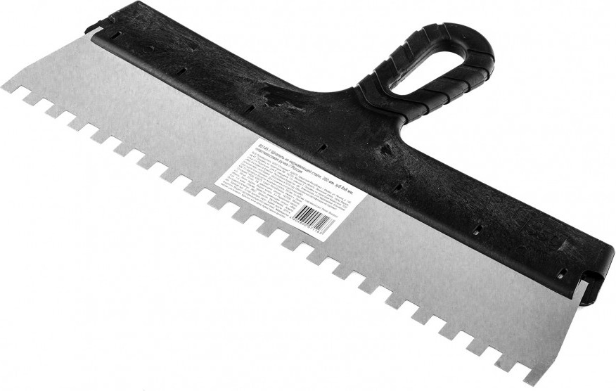 Шпатели с прямоугольными зубьями применяются для разравнивания клеевых растворов с последующей укладкой облицовочного материала: керамическая плитка, натуральный камень и др. Оснащены облегченной эргономичной пластмассовой рукояткой. Есть отверстие для подвешивания. Полотно надежно скреплено с рукояткой, не теряет форму после изгиба.