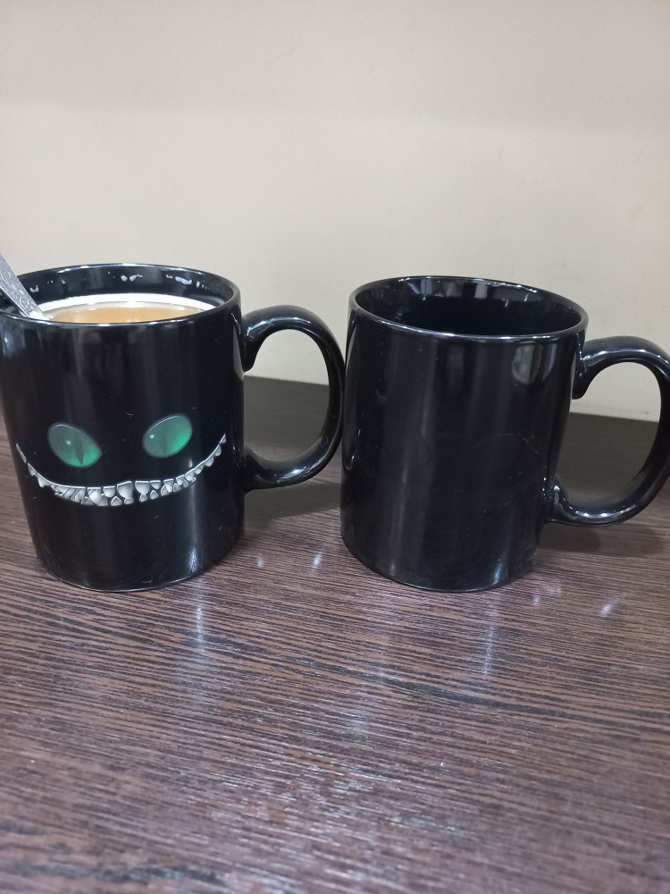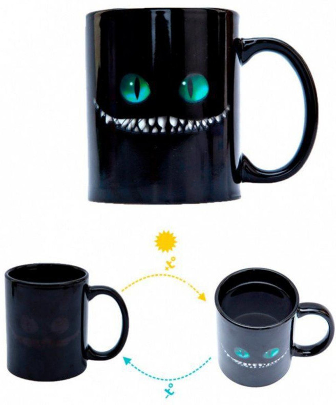 Кружка обычная но, когда проявляется улыбка Чеширского кота, становится весело)) Проявляющийся рисунок это своеобразный термометр, если появилась улыбка значит в кружке не холодная жидкость.