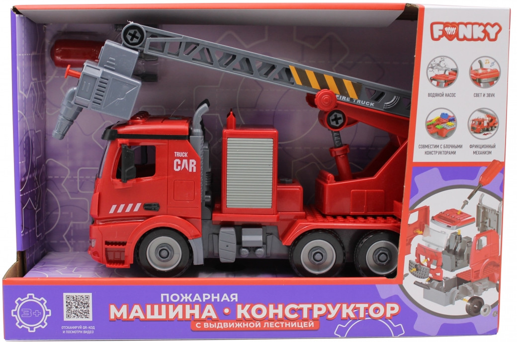 Funky Toys Машина пожарная с выдвижной лестницейВ данный момент этот товар отсутствует в продаже. Возможно, у нас найдется аналогичный или похожий товар здесь. Пожарная машина-конструктор удивляет своей функциональностью: ее можно разобрать и собрать заново с помощью входящих в комплект инструментов, а также модифицировать деталями блочного конструктора. Пожарная машина может потушить пожар: у нее выдвигается лестница, на конце которой имеется небольшой резервуар для воды и кнопка водяной помпы. Фрикционный механизм, поворотная платформа, световые и звуковые эффекты делают игру более реалистичной! Многофункциональная модель порадует ребенка, став незаменимой частью его увлекательных сюжетно-ролевых игр. |