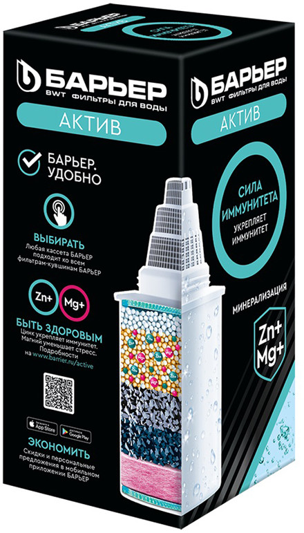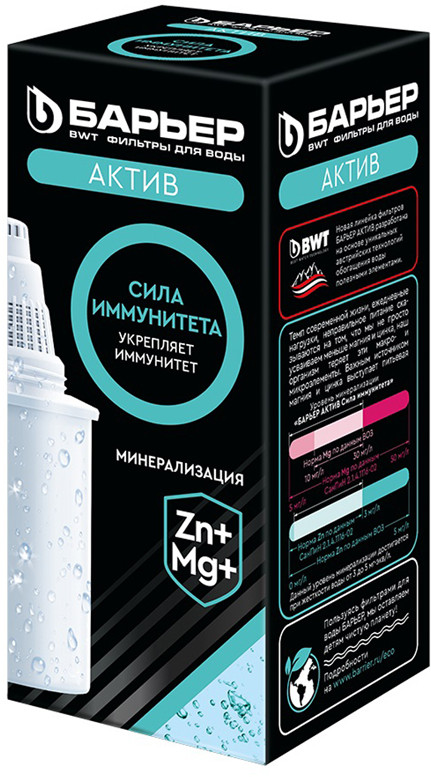 Серия: Актив Обогащает воду цинком и магнием. Цинк укрепляет иммунитет. Магний помогает бороться со стрессом. Очищает водопроводную воду от хлора и других вредных примесей, препятствует образованию накипи в чайнике, удаляет посторонние привкусы и запахи. |