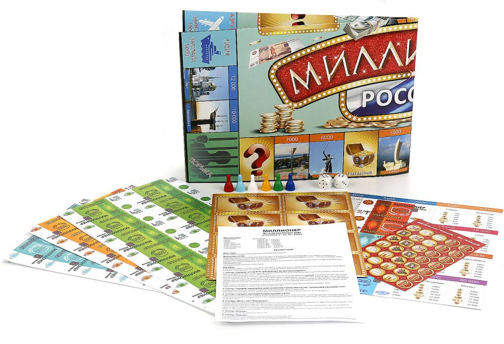 Настольная игра-викторина «Миллионер. Россия» — уникальная разработка ТМ «УМка» для развития детей. Она изготовлена из картона и пластика, состоит из основного поля с секторами — коммерческими объектами для ходов, фишек, кубика, карточек с заданиями для дополнительных полей, набора денежных знаков. Правила игры прилагаются. В ходе игры дети покупают объекты, улучшают их, платят налоги, зарабатывают деньги, выполняют задания с карточек, учатся считать, расширяют кругозор, развивают воображение, мелкую моторику рук, внимание, усидчивость, память и умение сопереживать. |
