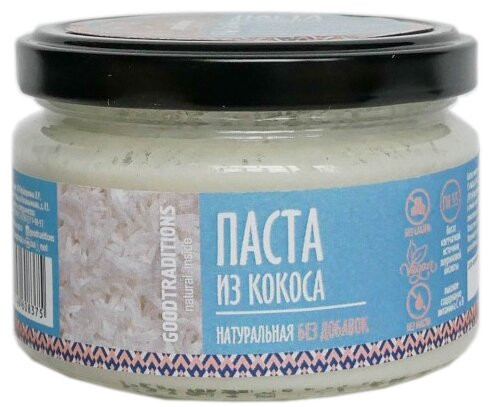 Твердая, плотная паста из очень мелко перемолотой "мякоти" кокоса. Без содержания сахара. Вкус - хороший, но хотелось бы более крупный "помол"