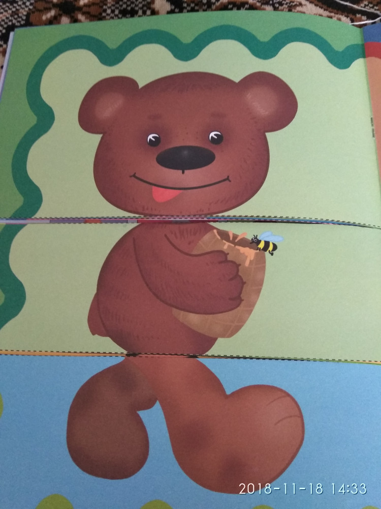 Книга большая формата А4, обложка глянцевый картон, листы плотные, но если учесть, что это книга- игрушка а двухлетниие детки ещё не умеют аккуратно листать то нужны листы плотнее. Многие пишут в отзывах, что ламинируют листы скотчем. На иллюстрация 12 животных. Некоторые рисунки странные, например ноги кота подходят медведь и можно понять что они не те только по цвету фона. Деткам наверное будет трудно. Листы необходимо разрезать самим на три части по пунктирным линиям. Даже если очень стараться получается не идеально. Каждая часть крепится к обложке одной скрепкой для прочности необходимо самим добавить ещё по скрепке на каждую часть в противном случае отверстия быстро расшатываются. В целом книгу рекомендую. Но придётся повозиться. Хотя цена по моему мнению завышена.