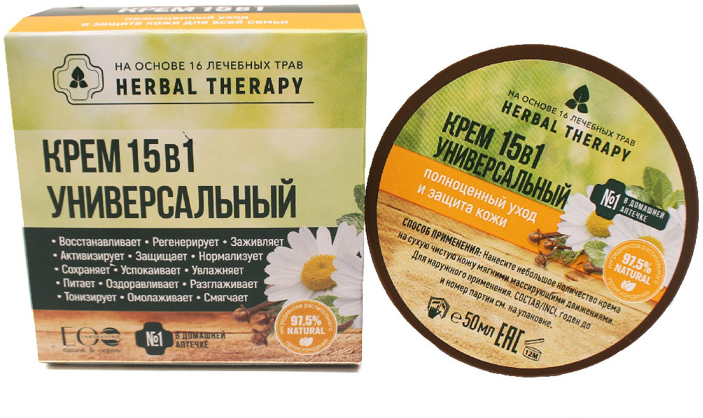Eco Laboratorie Крем универсальный 15 в 1В данный момент этот товар отсутствует в продаже. Возможно, у нас найдется аналогичный или похожий товар здесь. Крем универсальный 15 в 1 на основе 16 лечебных трав и активного комплекса для восстановления кожи, обеспечивает полноценный уход и защиту кожи всей семьи. Благодаря регенерирующему эффекту, ускоряет восстановительные и заживляющие процессы кожных покровов. Улучшает состояние чувствительной и сухой кожи, успокаивает, уменьшает раздражение. Крем можно использовать для защиты, увлажнения, питания, смягчения, омоложения и для ухода за поврежденной и чувствительной кожей. |