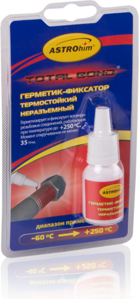 Герметик фиксатор резьбы неразъемный термостойкий — предназначен для герметизации и фиксации резьбовых соединений (в том числе и трубных), работающих при температурах до +250 С и требующих разборки только в случае капитального ремонта. Также может использоваться для фиксации и герметизации соединений вида вал-втулка, фиксации подшипников без прессовой посадки.