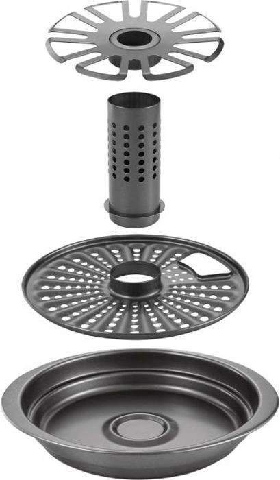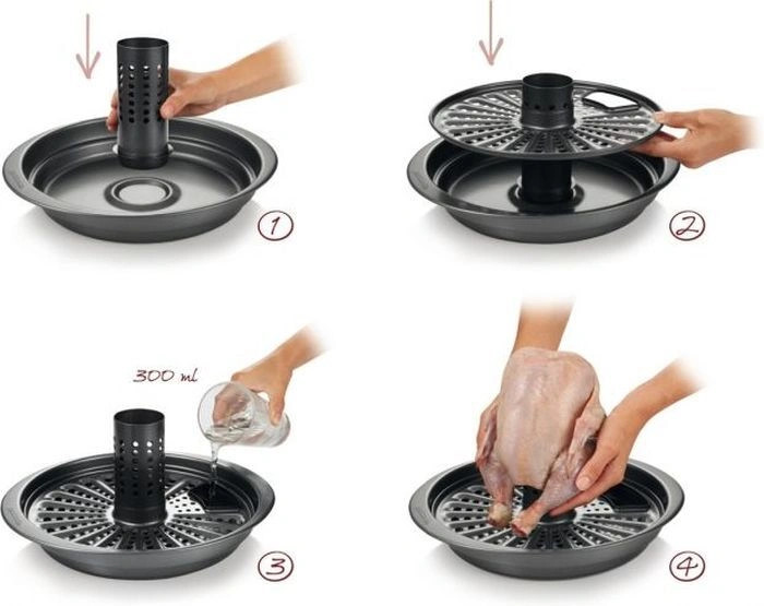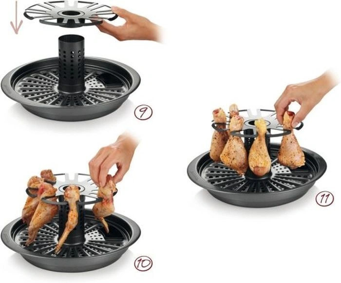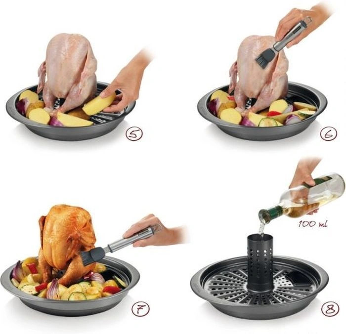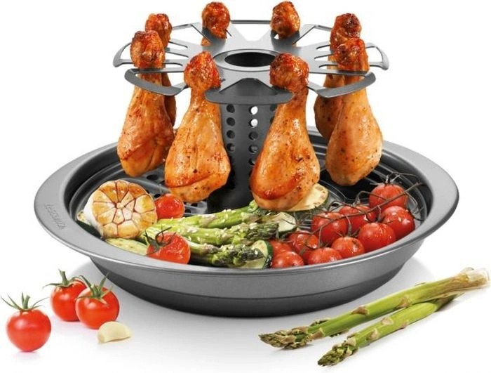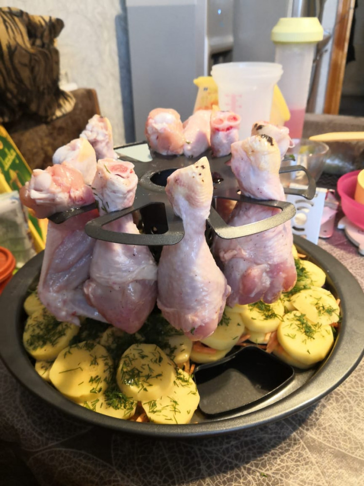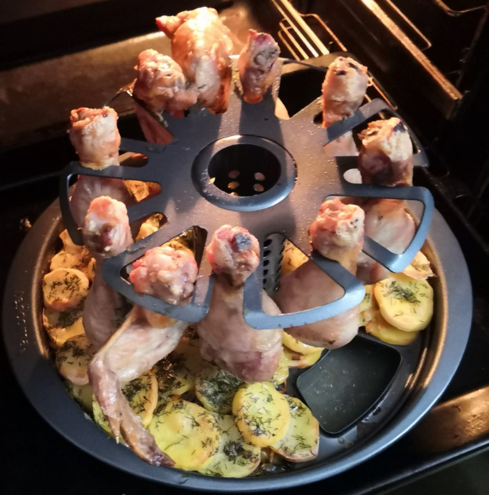 Очень понравилась подставка! Готовое блюдо смотрится эффектно! Вкусно: нет масла, хорошо все запеклось и зарумянилось. Картошку нарезала кружочками (дырочки в поддоне крупноватые), сверху красный/белый лук, морковь и болгарский перец, укроп. В Цилиндр немного белого вина, в основание - воду. На решетку - куриные голень и крылья. Голень вставила, как на рисунке, а крылья - в выемки... оказалось, так можно и удобно.