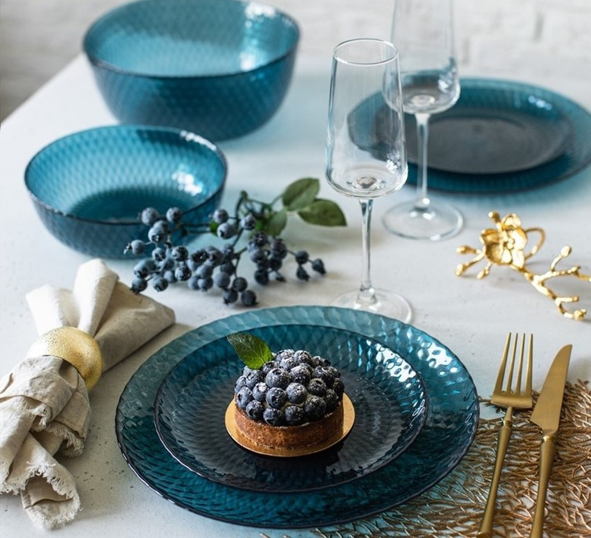 Брала посуду под свои такие же бокалы. Рисунок и цвет совпал один в один. Цвет глубокий и насыщенный темно - бирюзовый. Скорее это блюдо, чем тарелка. Размер 25см. Большой. Купила через казпочту. Упаковали очень хорошо. Жду 2 часть посылки. Надеюсь на казпочту. Флипу отдельное спасибо за упаковку