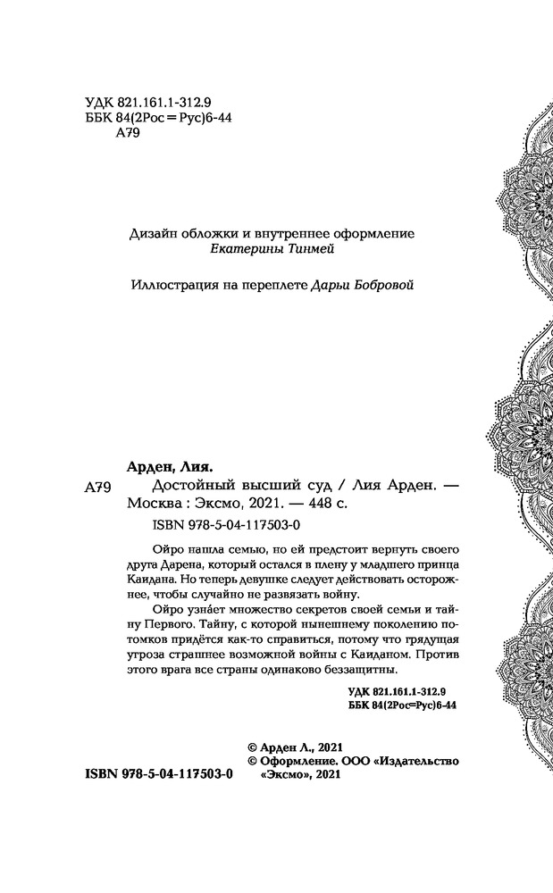 Достойный высший судВ данный момент этот товар отсутствует в продаже. Возможно, у нас найдется аналогичный или похожий товар здесь. Серия: Universum. Потомки Первых. Миры Лии Арден Ойро нашла семью, но ей предстоит вернуть своего друга Дарена, который остался в плену у младшего принца Каидана. Но теперь девушке следует действовать осторожнее, чтобы случайно не развязать войну. |