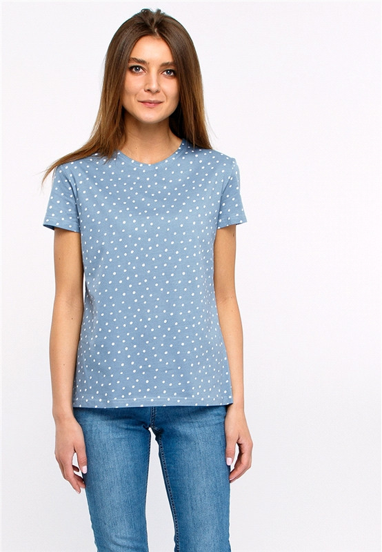 Футболка выполнена из легкого хлопкового полотна. Изделие свободного покроя с короткими рукавами и округлым вырезом горловины.