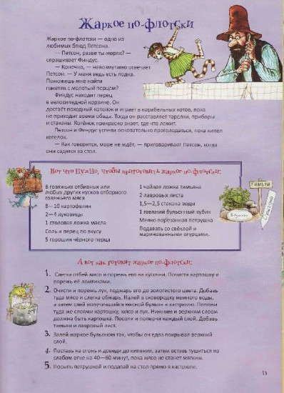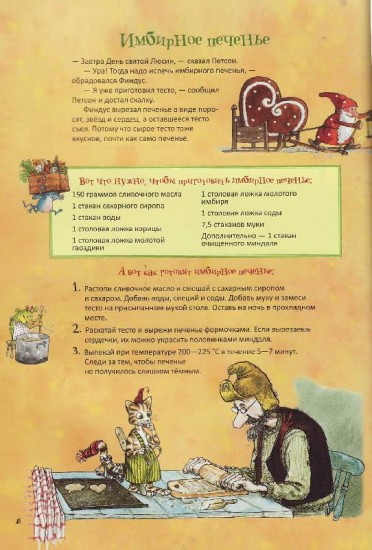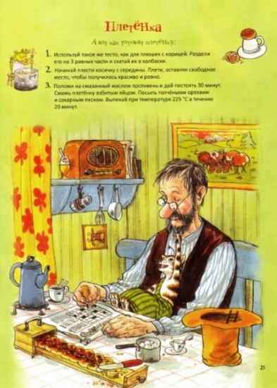 Готовим вместе с Петсоном и ФиндусомВ данный момент этот товар отсутствует в продаже. Возможно, у нас найдется аналогичный или похожий товар здесь. Серия: Петсон и Финдус Ни для кого не секрет, что Петсон — старик немного рассеянный. Мука у него может оказаться под диваном, а перец в велосипедной корзине. Его прекрасные рецепты разбросаны по всему дому. Однажды котенок Финдус решил, что пора собрать их в кулинарную книгу, и вот что из этого получилось! Петсон и Финдус научат вас печь пироги и плюшки, варить супы, кисели, каши и даже готовить морковный мармелад. Рецепты у Петсона очень простые и вкусные, к тому же каждому из них предшествует небольшая история из жизни старика и котенка. Большинство блюд дети постарше могут приготовить сами, а для самых маленьких предусмотрены задания попроще, которые обычно выполняет Финдус: скатать из фарша тефтельки, смешать соус, отмерить молоко и муку или натолочь сухари. |