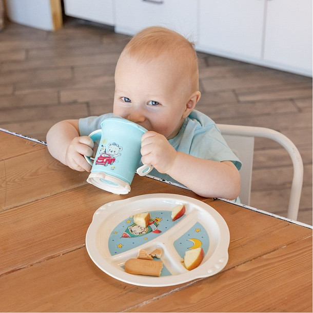 Очень удобно, что крышка снимается и поильник превращается в стаканчик с двумя ручками. Резиновое основание не скользит на столике. В общем удобство во всём