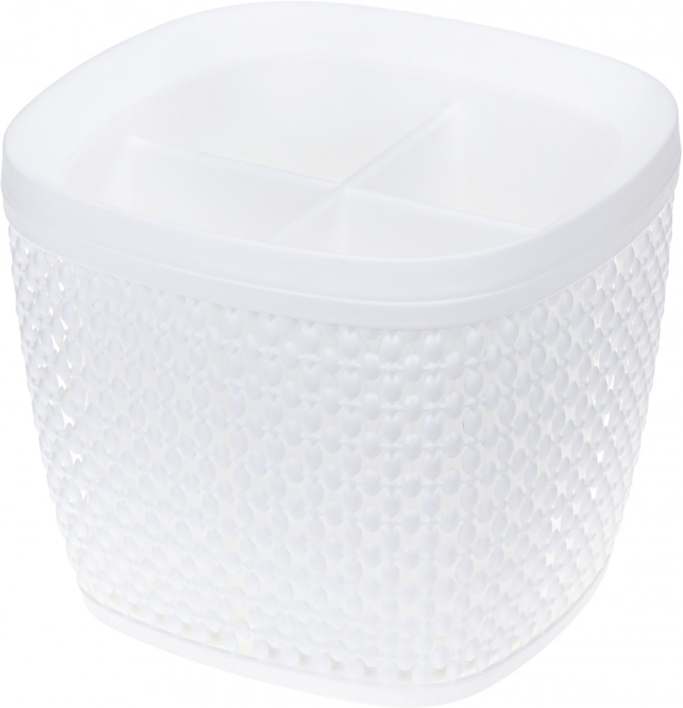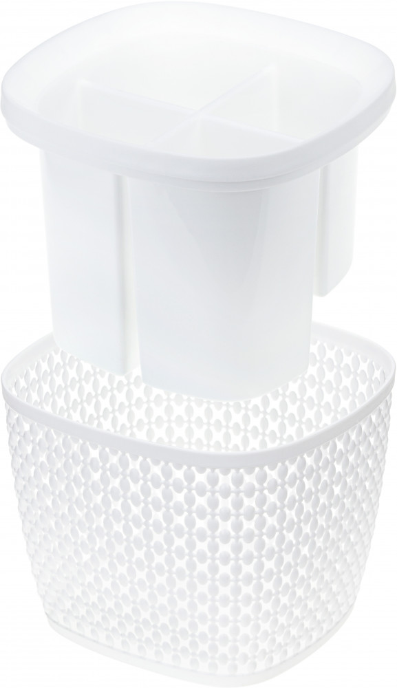 Не пожалела ,что приобрела эту подставку... Очень оригинально смотрится ,приятного белого оттенка... Вместительная.... Отделения имеют разный уровень глубины ,что удобно для чайных ложек или других каких столовых приборов... Внутренняя часть легко вынимается ,но при этом плотно сидит в корзине(при использовании не болтается)... В общем я нашла только плюсы...