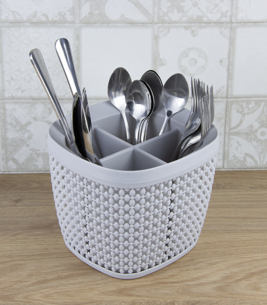 Не пожалела ,что приобрела эту подставку... Очень оригинально смотрится ,приятного белого оттенка... Вместительная.... Отделения имеют разный уровень глубины ,что удобно для чайных ложек или других каких столовых приборов... Внутренняя часть легко вынимается ,но при этом плотно сидит в корзине(при использовании не болтается)... В общем я нашла только плюсы...