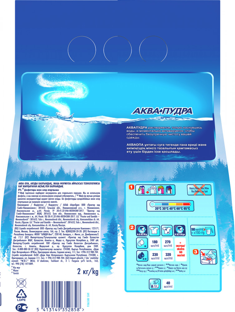 Способ применения: для достижения наилучших результатов используйте 150 г стирального порошка на 1 загрузку белья (до 5 кг).
