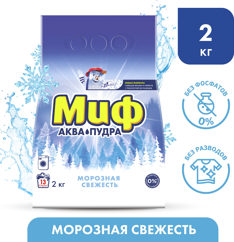 Стиральный порошок Миф «Аквапудра Морозная Свежесть» — это новая, лучшая формула Миф для сияющей белизны, с технологией против разводов. Стиральный порошок Миф «Аквапудра» растворяется едва коснувшись воды, и моментально активируется: удаляет даже трудновыводимые пятна и придает одежде сияющую белизну. С помощью технологии против разводов, Миф помогает эффективно справляться с загрязнениями, не оставляя разводов на одежде. Только чистота и морозная свежесть!