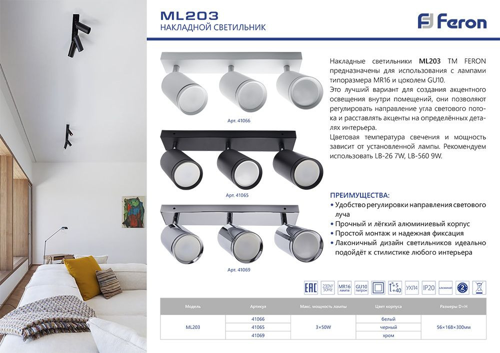 Накладные светильники ML203 TM FERON предназначены для использования с лампами типоразмера MR16 и цоколем GU10. Это лучший вариант для создания акцентного освещения внутри помещений, они позволяют регулировать направление угла светового потока и расставлять акценты на определённых деталях интерьера. Цветовая температура свечения и мощность зависит от установленной лампы. Рекомендуем использовать LB-26 7W, LB-560 9W.
