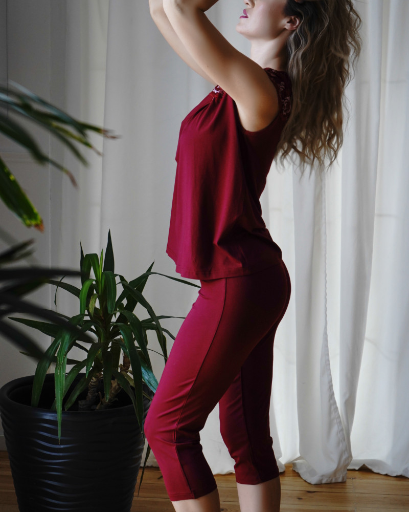 Комплект отличный : мягонький, удобный, кружева тоже не колятся. Взяла на размер больше и не пожалела- очень удобно, нигде не давит. Качественно пошит - нитки не торчат и не распускаются. Можно носить как домашнюю одежду или как пижаму. Цвет бордовый. Брала по скидке, что вдвойне приятно. К покупке очень рекомендую. Если будет в наличии синий моего размера, то обязательно закажу ещё один комплект.
