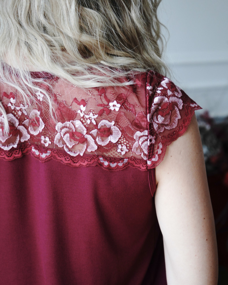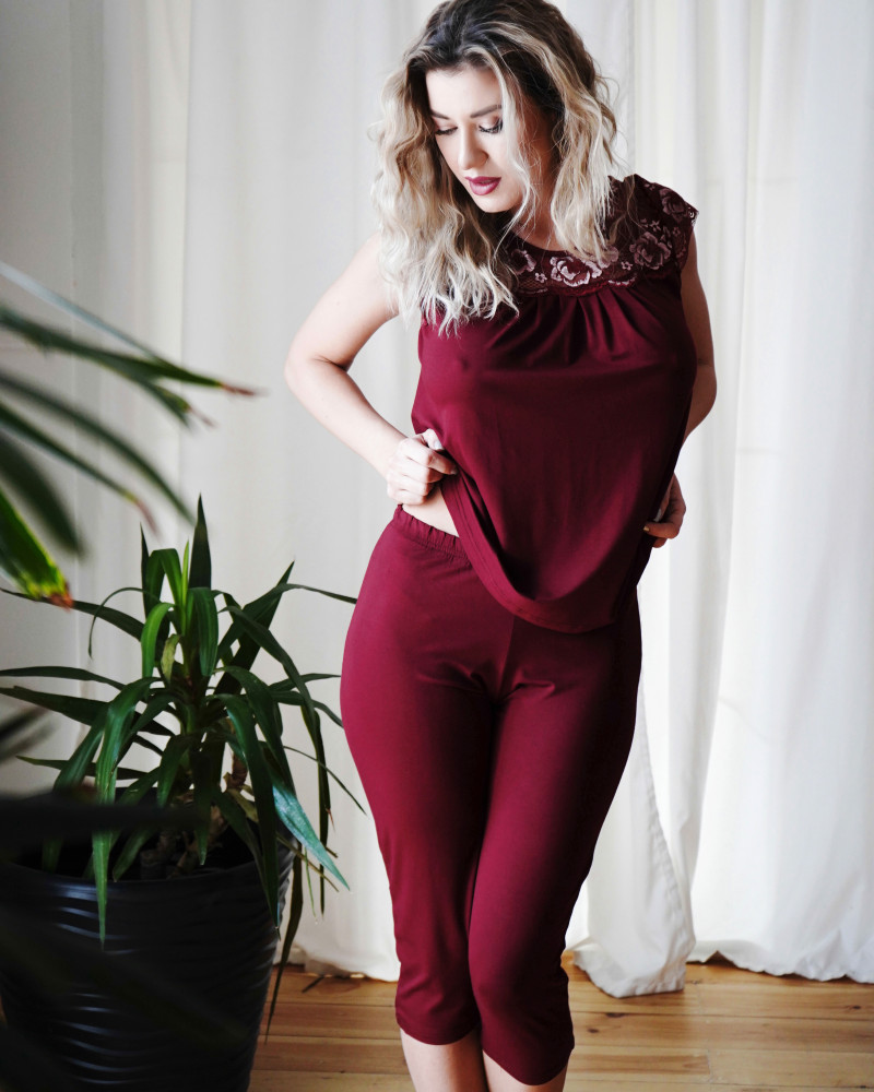 Комплект отличный : мягонький, удобный, кружева тоже не колятся. Взяла на размер больше и не пожалела- очень удобно, нигде не давит. Качественно пошит - нитки не торчат и не распускаются. Можно носить как домашнюю одежду или как пижаму. Цвет бордовый. Брала по скидке, что вдвойне приятно. К покупке очень рекомендую. Если будет в наличии синий моего размера, то обязательно закажу ещё один комплект.