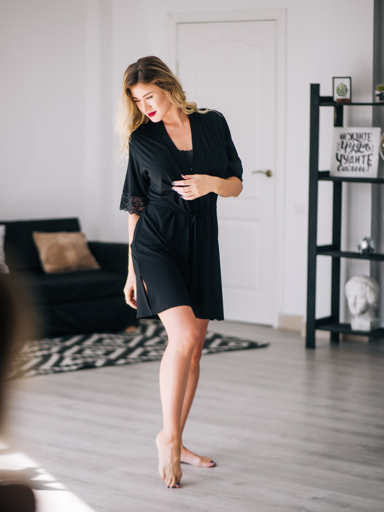 Взяла снохе в подарок, плюс ещё халатик. С размером угадала. Снохе вроде бы понравился. Она у меня не высокая, но короткий вариант для неё выше колена. Но она сказала, что стройнит, а то после ковида поправилась. Купила чёрного цвета комплект