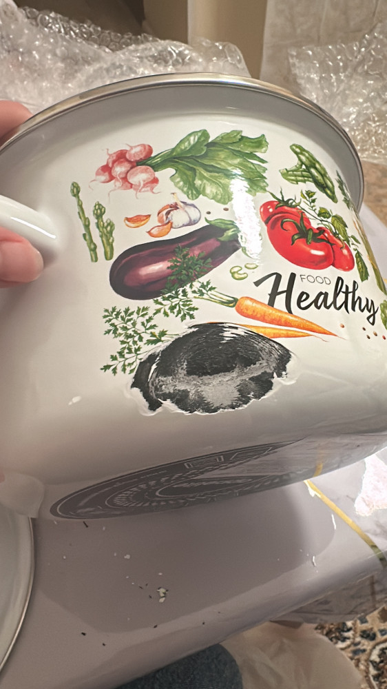 Кастрюля пришла бракованная, с большой вмятиной и отколотой эмалью