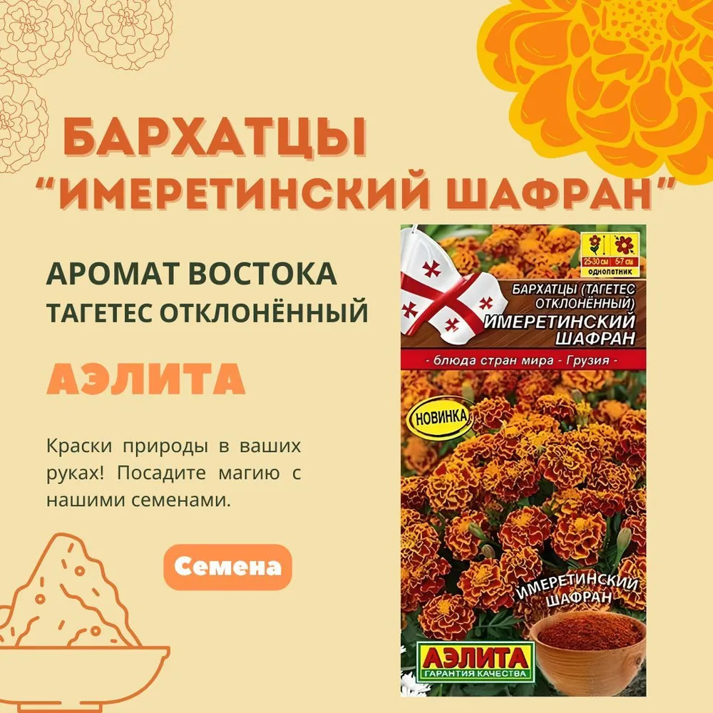 Аэлита Семена бархатцев «Имеретинский шафран»+12 высокая всхожесть приятный аромат красивые цветы крепкая рассада несоответствие описанию