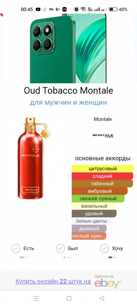 Брала вслепую. Парфюм полностью оправдал мои ожидания. Табак если и есть, то где-то на заднем плане. Очень мягкий приятный запах, на мой нос, сухофруктов и я слышу вишенку, хотя она не заявлена. Возможно так цитрусы себя проявляют. Взяла для себя. Нанесла на руку, не дав отстоятся с дороги, вдыхаю уже несколько часов, довольно стойкий парфюм. Пахнет дорого.