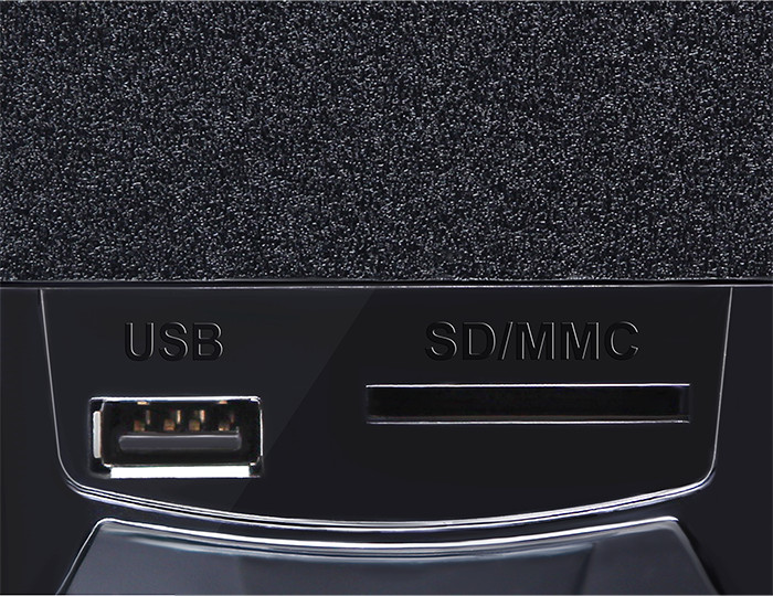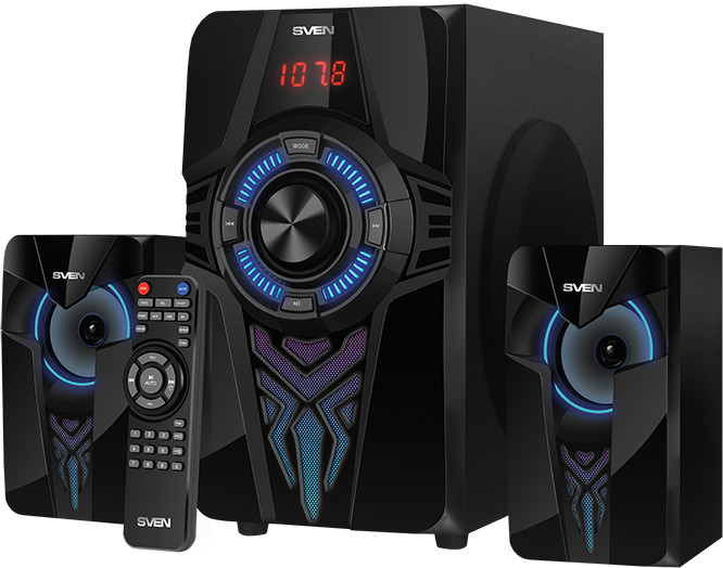 Отлично подходят колонки и для просмотра кино или воспроизведения музыки. Помимо проводного подключения к компьютеру или приставке возможна беспроводная передача сигнала по Bluetooth, прослушивание радио с помощью встроенного тюнера или воспроизведение треков, записанных на USB-flash и SD. Управлять акустикой 2.1 можно с помощью удобного пульта ДУ, а вся информация о ее работе отображается на удобном LED-дисплее.