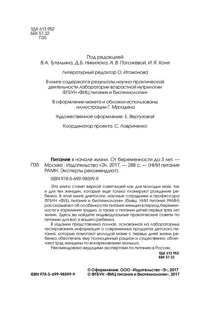 Серия: НИИ питания РАМН. Эксперты рекомендуют Эта книга станет верной советчицей как для молодых мам, так и для тех женщин, которые еще только планируют рождение ребенка. В этой книге диетологи, научные сотрудники и профессора ФГБУН «ФИЦ питания и биотехнологии» (бывш. НИИ питания РАМН) рассказывают об особенностях питания женщин в период беременности и кормления грудью, а также о питании детей первых трех лет жизни. |