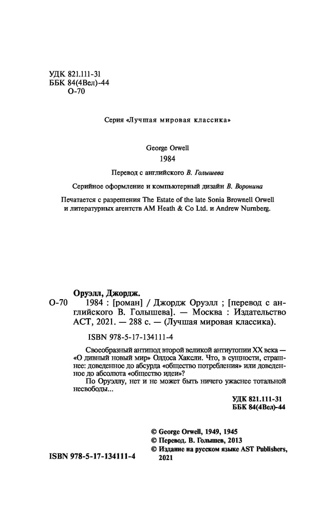 1984В данный момент этот товар отсутствует в продаже. Возможно, у нас найдется аналогичный или похожий товар здесь. Серия: Лучшая мировая классика Своеобразный антипод второй великой антиутопии ХХ века — «О дивный новый мир» Олдоса Хаксли. Что, в сущности, страшнее: доведенное до абсурда «общество потребления» или доведенное до абсолюта «общество идеи»? |