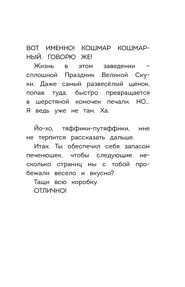 Захватывающе—хвостокрутительнейшая история, которая читается на одном дыхании, искромётный юмор и весёлые иллюстрации на каждой странице не оставят равнодушными ни одного любителя животных. Будет круто! Обнимашки! |