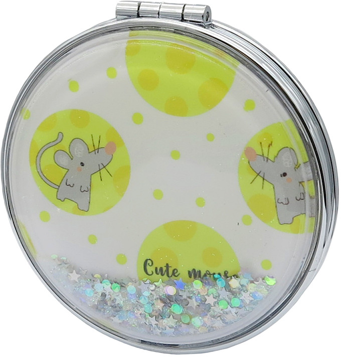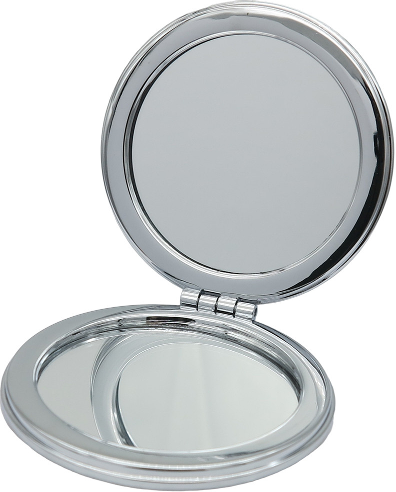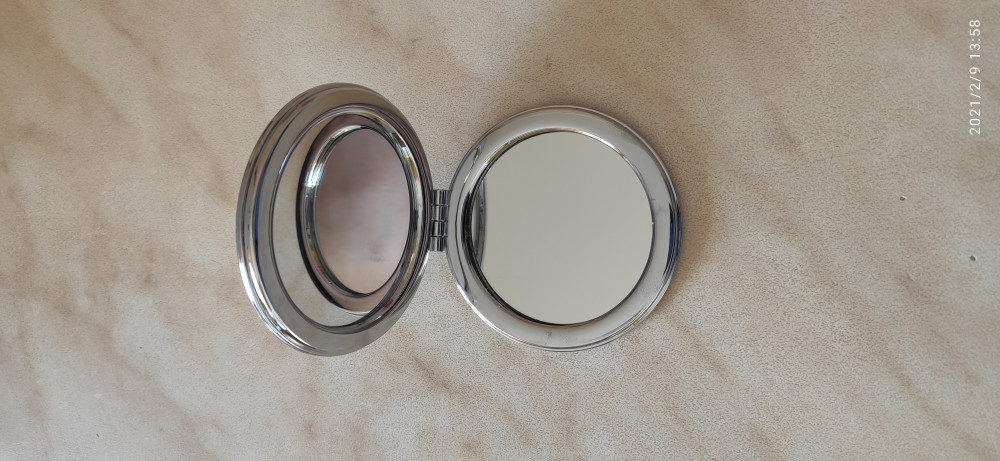 Компактное двойное зеркало изготовлено из металла и стекла. Изделие имеет двукратное увеличение одной из сторон. Тончайшее стекло, используемое при изготовлении, не даёт искривлений зеркальной поверхности.