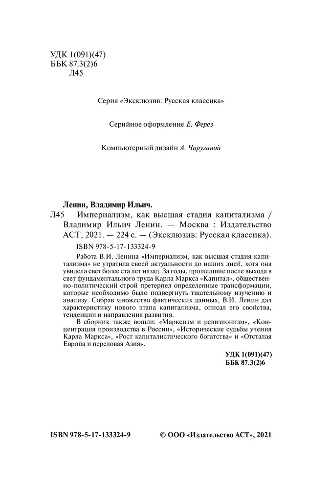 💳 Оплатить за товар можно при получении 🇰🇿 Есть бесплатная доставка по Казахстану от 1 дня 🎁 Копите бонусы с каждой покупки Серия: Эксклюзив: Русская классика Работа В.И. Ленина «Империализм, как высшая стадия капитализма» не утратила своей актуальности до наших дней, хотя она увидела свет более ста лет назад. За годы, прошедшие после выхода в свет фундаментального труда Карла Маркса «Капитал», общественно-политический строй претерпел определенные трансформации, которые необходимо было подвергнуть тщательному изучению и анализу. Собрав множество фактических данных, В.И. Ленин дал характеристику нового этапа капитализма, описал его свойства, тенденции и направления развития. |