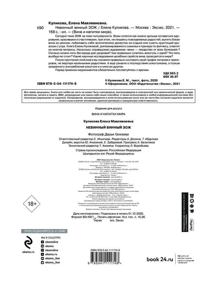 Невинный винный ЗОЖВ данный момент этот товар отсутствует в продаже. Возможно, у нас найдется аналогичный или похожий товар здесь. Серия: Вина и напитки мира Сегодня тема ЗОЖ на пике популярности. Всем хочется как можно дольше оставаться здоровыми, красивыми и счастливыми, при этом не лишаясь повседневных радостей — выпить бокал вина за ужином, побаловать себя экзотическим десертом на отдыхе или съесть хрустящий круассан с утра. Книга Елены Куликовой, дипломированного сомелье и тренера по фитнесу, ответит на многие вопросы. Насколько справедливо выражение «вино — лекарство от всех болезней»? Сколько можно пить без вреда для здоровья? Как правильно сочетать алкоголь с едой? Что пить вообще не стоит? Какие научные исследования целебных свойств вина проводятся в мире? |