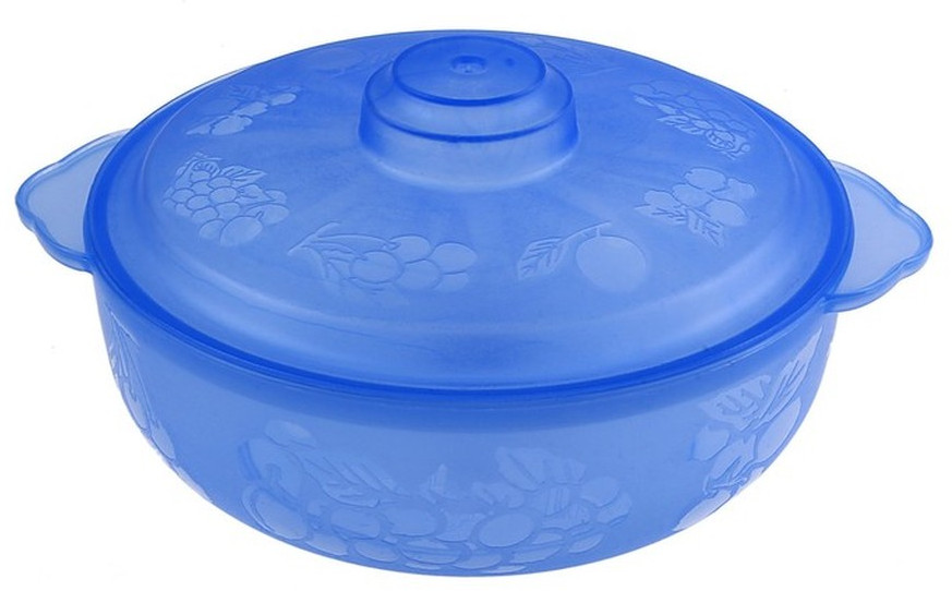 Много лет назад была голубая, бережно хранит еду, крышка да немного не удобная - но со временем привыкаешь😊, пластмассой не пахнет🙂, цвет как заявлено