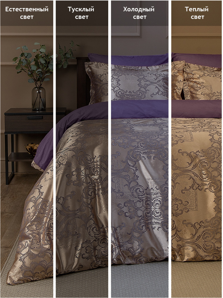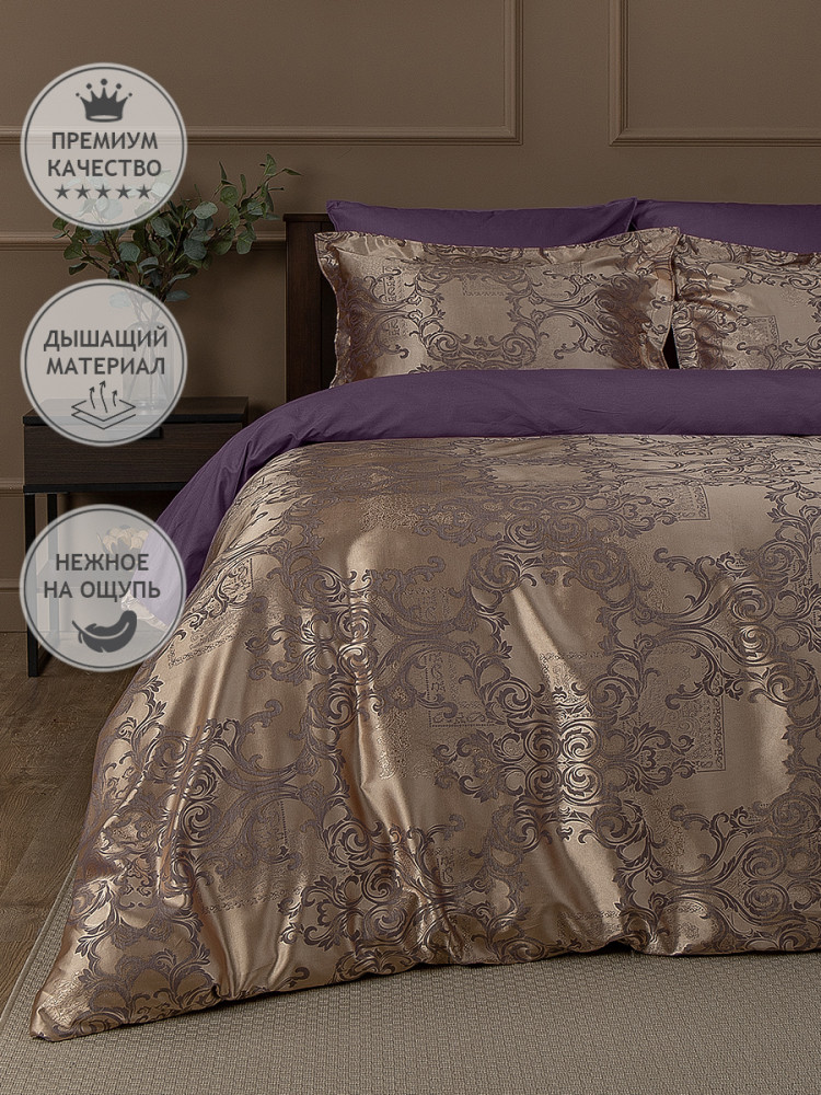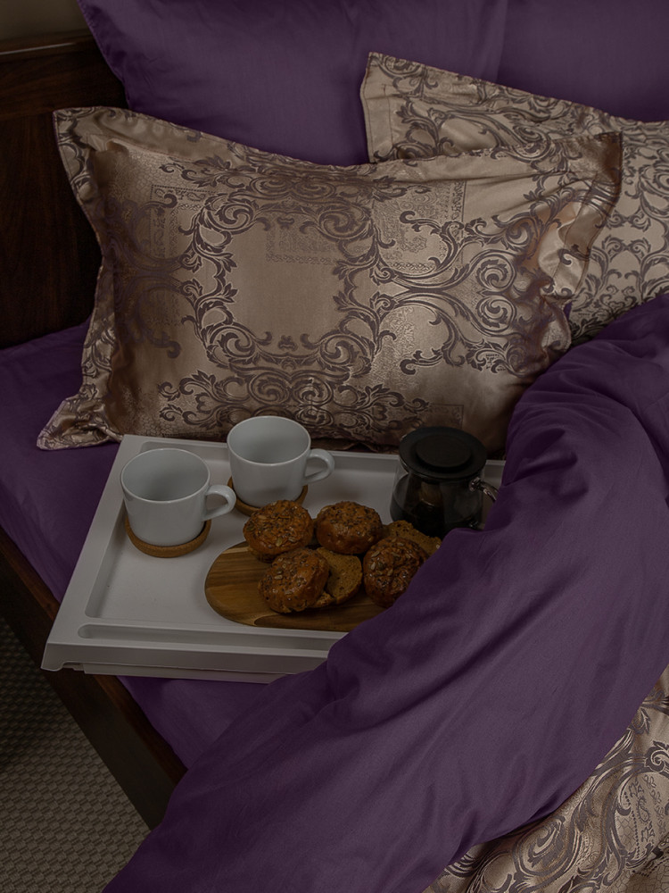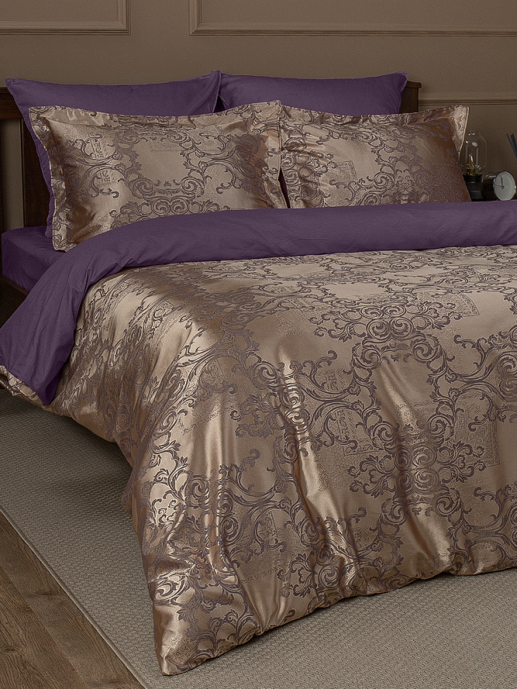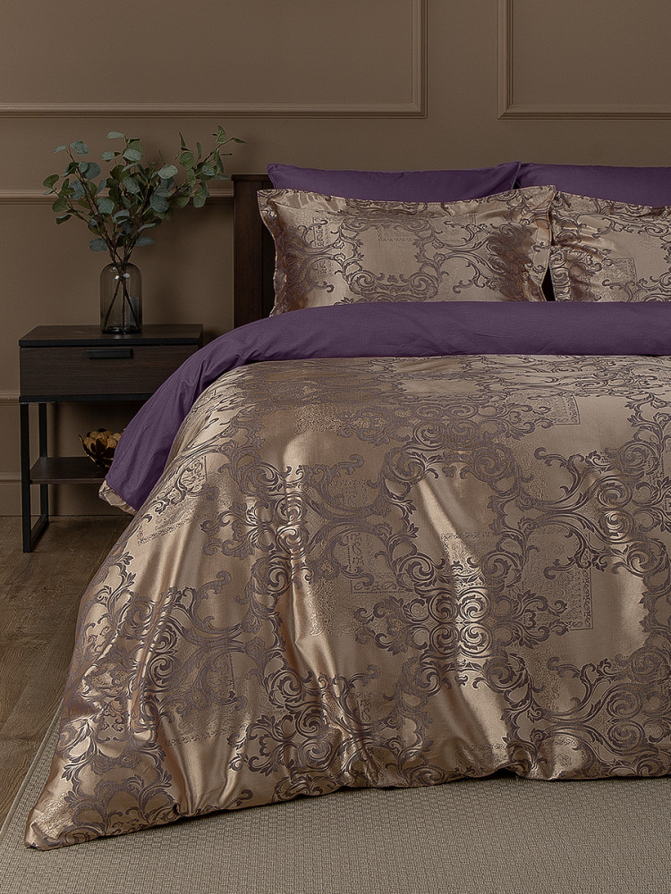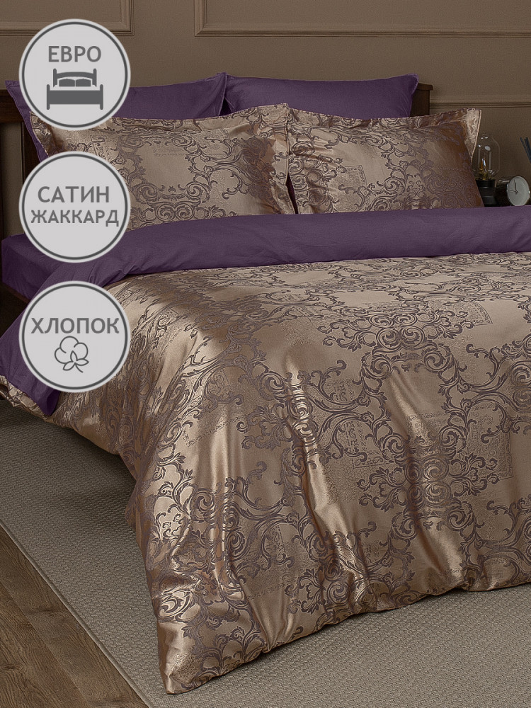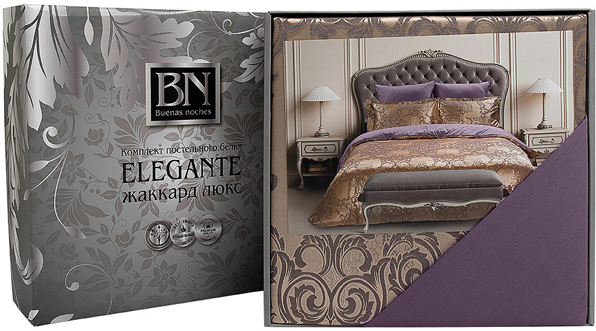 Роскошное постельное белье из коллекции «Сатин жаккард» торговой марки «Buenas Noches» относится к категории «премиум». Благодаря современному производству оно надолго сохраняет свою красоту, даже при многочисленных стирках. Комплект производится из двух видов тканей — верхняя сторона (лицевая сторона пододеяльника и декоративных наволочек) выполнена из жаккардовой ткани с благородным, фактурным тканым орнаментом (65% хлопок, 35% полиэстер); внутренняя часть (простыня, оборотная сторона пододеяльника, большие наволочки и обратная сторона декоративных наволочек) — из высококачественного хлопкового, однотонного сатина (100% хлопок). Сочетание роскошного жаккардового полотна с отменным хлопковым сатином дарят ощущение аристократической изящности и комфорта. Постельное белье из жаккарда по праву называется королевским.